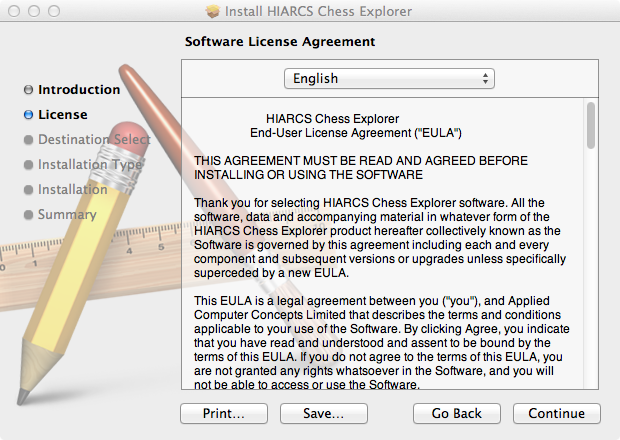 The Software License Agreement will then be displayed. You need to accept the terms of the End User License Agreement in order to be able to proceed to install and use the HIARCS Chess Explorer software.