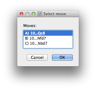 When stepping through a game using the Cmd+right arrow key, HIARCS Chess Explorer will give you a choice when you reach a position which has more than one move option (ie. where there a variations). The Select move dialog shows the move choices with the main continuation shown in bold. You can select the next move using the mouse, using the keyboard letter for the variation (here A, B or C) or using the arrow keys, up or down to change the choice and the right arrow or enter key to select the move.