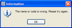 If there is something wrong with the entered license name and code you will be given the following dialog: