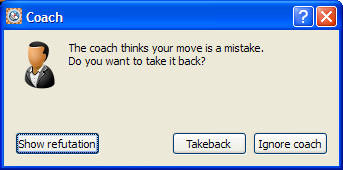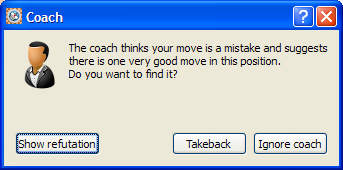 You can ask the coach to demonstrate the refutation of the move you made by clicking the Show refutation button.The refuting move will then be demonstrated on the board. You have two options, you can Ignore the coach and continue playing or accept the coach advice and takeback the move.and consider your previous move again.