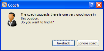As well as pointing out mistakes the coach can spot when you have missed a very good move when it will display a dialog like the following: