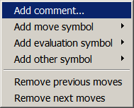 To add a comment select the Add comment... menu item from the move context menu. You can edit or remove a comment by clicking on the comment. Either of these approaches will bring up the Edit comment dialog where you can add, edit and remove comments and diagrams from the Game Notation.