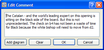 You can also edit any existing comment by simply clicking on the comment in the Game Notation pane. You can then edit it in this Edit comment dialog. While editing a comment the comment will be underlined in the Game Notation pane.