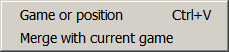 This submenu allows you to paste a Position or a Game from the clipboard into the current tab. This enables you to copy positions or games from other programs or between tabs inside HIARCS Chess Explorer. The Merge with current game menu option enables you to merge a game with the current game in the Game Notation pane. This is a very powerful analysis feature, you can read more about this unique analysis feature in the Merge game section.