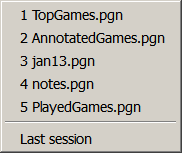 This menu item gives a submenu of recently opened PGN databases, you will see a list of the databases you have recently opened, you can choose one of these and it will be opened in a new tab. You can also open all the databases in the last session by selecting the Last session option. The above submenu image is an example.