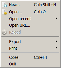 The File menu allows you to manipulate files. Please note the shortcut keystroke for common operations are also defined on the menu, you can use the keyboard shortcut to invoke the associated function directly from the keyboard. You can also see shortcut icons for some menu items on the menu as a guide that there is a shortcut toolbar icon for the option.