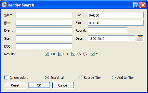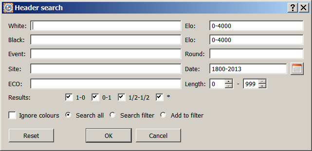 Accessed by clicking the Header search shortcut icon.The dialog is also accessed from the Search->Header menu item. This dialog allows you to search the current database for games matching the search criteria, the search results are known as the as the search filter.