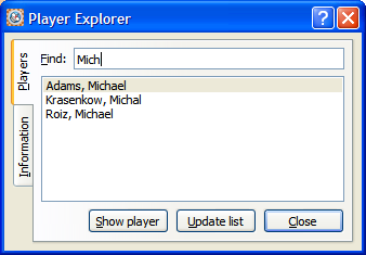 To select a player or the whole database you can click on the appropriate player and click the Show player button to view the details about that player. Alternatively if you double click a player from the list, the Information tab will automatically open to show you those details.