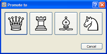User InterfaceDisplay dialogs Promote to When a pawn reaches the eighth rank you will see the Promote to dialog displayed: Please select the piece you wish to promote the pawn to. If you want to cancel the promotion move and take it back, click Cancel.