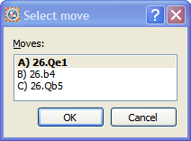 When stepping through a game using the Ctrl+right arrow key, HIARCS Chess Explorer will give you a choice when you reach a position which has more than one move option (ie. where there a variations). The Select move dialog shows the move choices with the main continuation shown in bold. You can select the next move using the mouse, using the keyboard letter for the variation (here A, B or C) or using the arrow keys, up or down to change the choice and the right arrow or enter key to select the move.