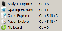 This menu item allows you to open the Analysis Explorer pane in the main window. The Analysis Explorer is used to analyse positions and games.