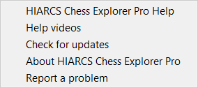 This menu opens the About HIARCS Chess Explorer Pro dialog where you can check the version you have and update to a higher spec HCE-Pro version.
