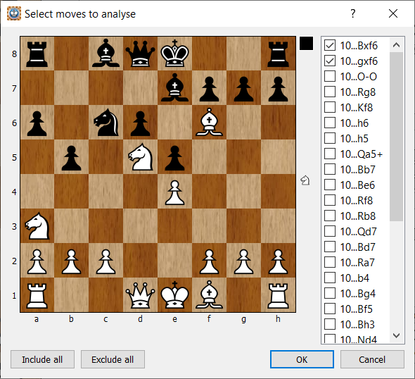 User InterfaceDialogs Select moves to analyse dialog The Select moves to analyse dialog enables you to select the moves an engine will analyse, this allows you to limit the move selection choice of the engine to moves you are interested in.