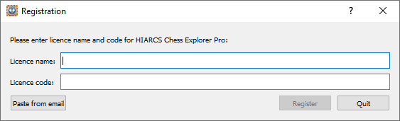 You can copy (Ctrl+C on Windows, Cmd+C on Mac) and paste (Ctrl+V) the license name and code into each field. Once you have entered the license name and code, click the Register button to activate HIARCS Chess Explorer Pro.