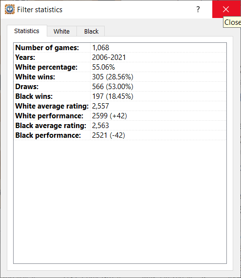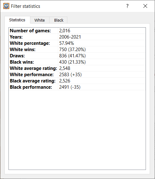 The Filter statistics allow you to view the statistics for the games shown in the Game Explorer game list or the Tree Explorer game list. These may reflect the entire database or the Filter if that is set.