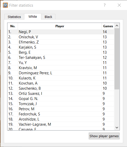 We can now see the players who have played the White side in most games. Now click the Black tab: