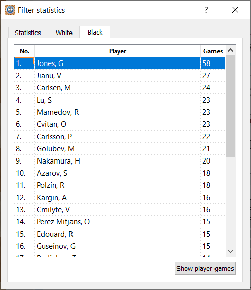 We can now see one GM in particular has played many more Dragon games than the other players. Since this is clearly a speciality of this player it would be interesting to view his games. Now double click Jones, G (or click the player and click Show player games). The filter is now set to those 58 games.