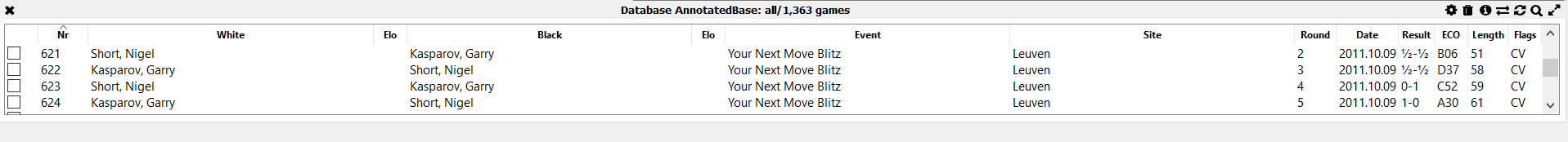 The Game Explorer enables you to explore and manipulate the games within a database. You can see the database name and how many games the current view shows out of the total database size.