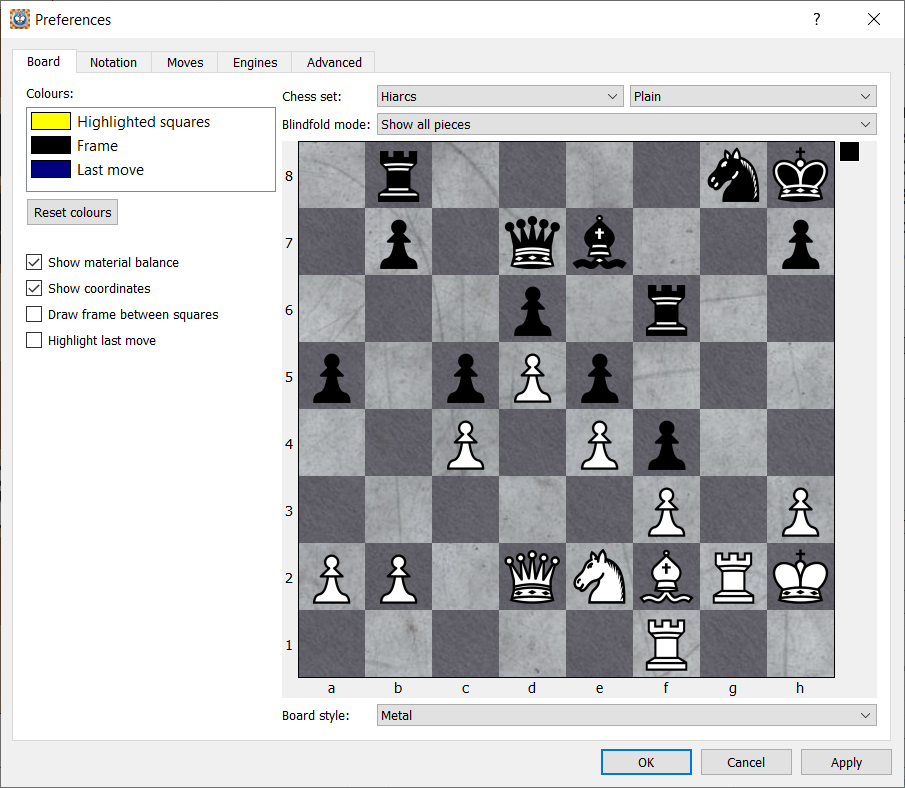 A frame around each square on the board can also be set on if you prefer it. Finally the last engine move can be highlighted although we have left this off by default as the move animation given by HIARCS Chess Explorer highlights the last move of an engine well in play mode.