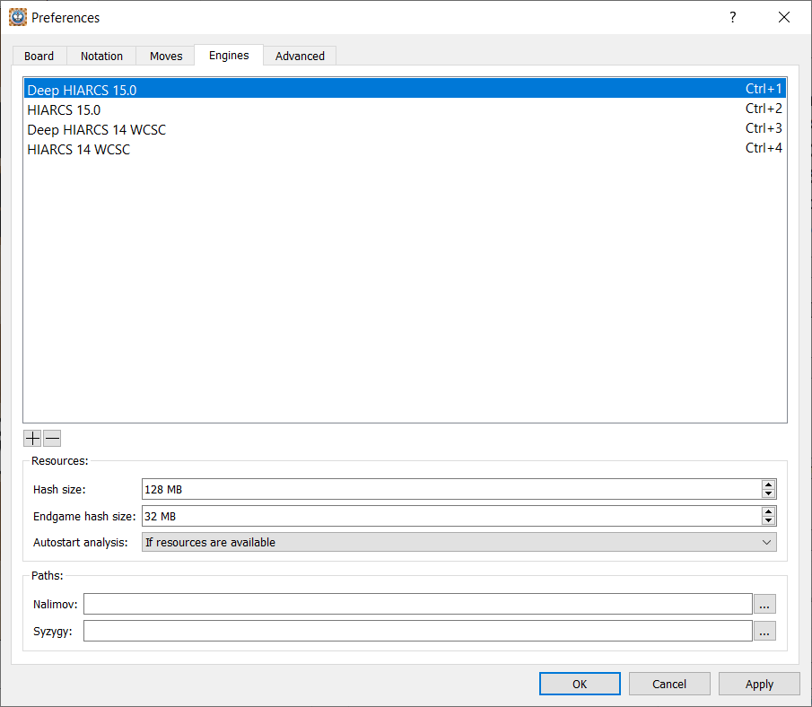 The Engines tab of the Preferences dialog handles adding, configuring and removal of chess engines.