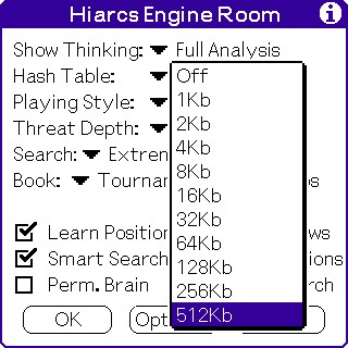 You can also set the Hash Table size for the engine. The available hash tables depend on the available dynamic ram on your device. Three playing styles are available, Normal, Aggressive and Solid with Normal being the default.