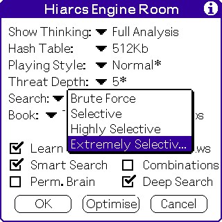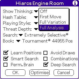 The Engine Room screen allows you to configure the HIARCS chess engine in detail. Select/tap the OK button to apply any changes to the Engine Room settings. Select/tap the Optimise button to set the parameters to their optimum settings. To cancel any changes tap the Cancel button. The following options can be checked on or off: