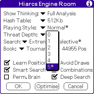 Threat Depth Search BookYou can configure the depth to which threats are computed ahead with the Threat Depth setting. The default of 5 is the best since it spots impeding threats better for both sides. The search can be configured for its degree of selectivity. The most effective setting is the Extremely Selective option which allows Hiarcs to reach greater search depths at little risk. You can download many opening books from www.hiarcs.com including the small, medium, large and full books. The book choice can be selected between a number of settings: