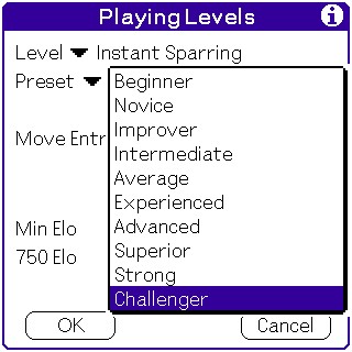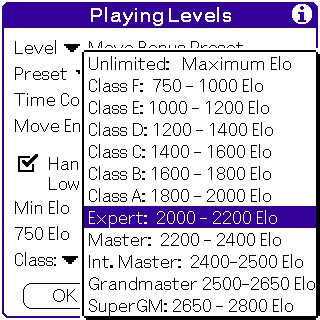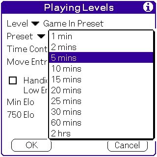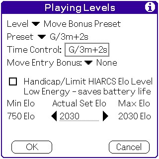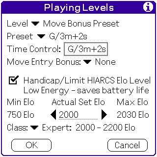 Handicap/Limit HIARCS Elo Class of Elo Handicap warningTo handicap/limit HIARCS to a specific Elo strength you should check the Handicap/Limit checkbox. Once selected, you can then either select the exact Elo you entering it into the numeric Actual Set Elo field or use the arrow buttons to decrement/increment the Elo count. The alternative is to use the Class selector to choose an Elo range. If you select a range at or above the maximum strength on your device Hiarcs will automatically switch off the handicap. The minimum Elo is set to 750 Elo for all Palm devices. The maximum Elo is computed based on the performance of your device and hence this figure varies widely between devices depending on the performance of the underlying hardware, especially the CPU. Time Control screen